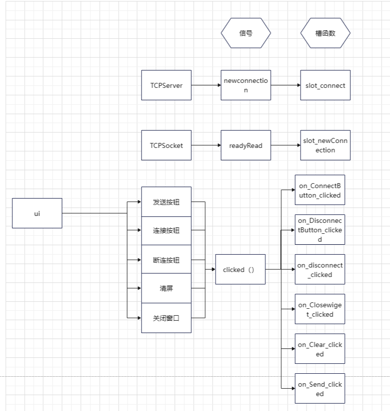 得益于Qt优秀的槽与信号机制,我们在客户端建立起信号与槽函数的连接,槽,信号与按键槽函数的链接关系如下图