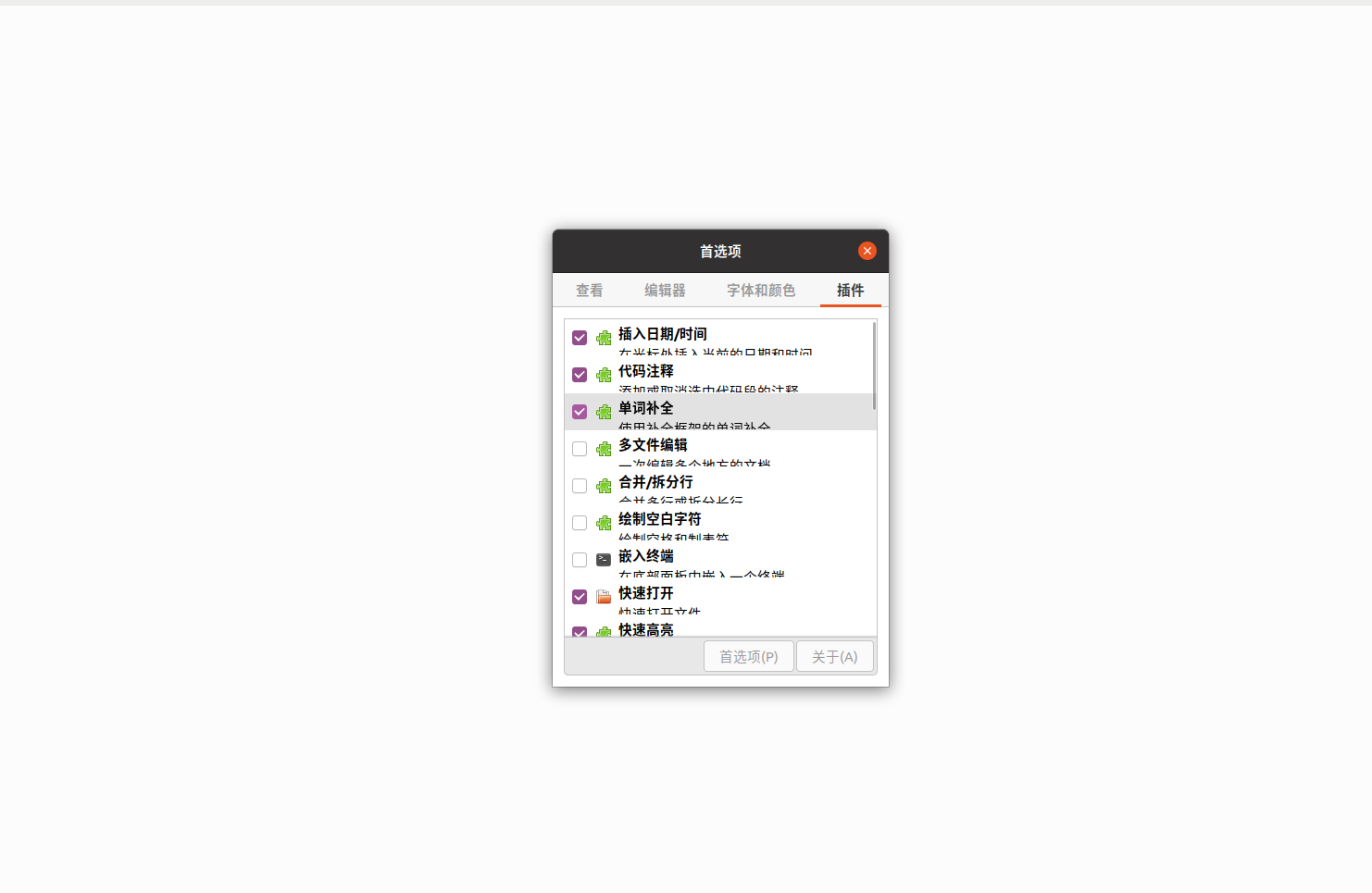 然后就可以在gedit的首选项中看到代码注释等插件