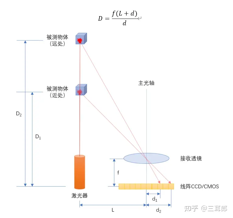 基本原理:激光器发射激光到被测物体,经物体反射后,通过透镜汇聚到CCD传感器上,当被测物体移动时,传感器上的光斑也会移动,通过几何三角关系可得出激光器到物体的距离,这也是被称为三角测距雷达的来源