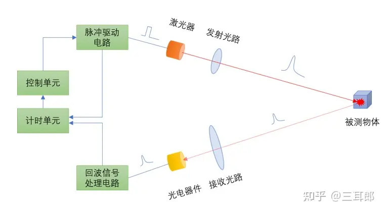 分为三角法,tof法,一般激光雷达是由激光发射器,接收器,信号处理单元,电机组成。